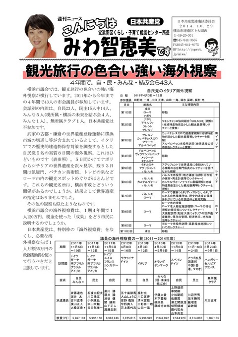 横浜市議会では、観光旅行の色合いの強い海外視察が横行しています。2011年から今年までの4年間で43人の市会議員が参加しています。会派別の内訳は、自民23人、民主15人中14人、みんな5人(現所属・横浜の未来を結ぶ会4人、みんな1人)、無所属クラブ1人。日本共産党は不参加です。