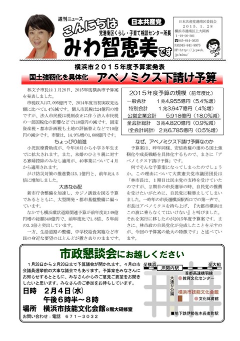 林文子市長は1月28日、2015年度横浜市予算案を発表しました。