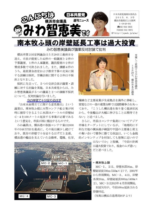横浜市第2回定例議会は5月29日に最終日を迎え、市長が提案した42件の一般議案と2件の予算議案、1件の人事議案、議員提案の2件が賛成多数で可決されました。また、請願4件のうち、最低賃金改定および教育予算の充実に関する請願は採択、労働法制に関する2件は不採択となりました。 採択に先立って、5つの交渉会派が議案・請願に対する討論を実施。日本共産党からは、みわ智恵美議員が5つの議案と2つの請願不採択について、反対討論を行いました。