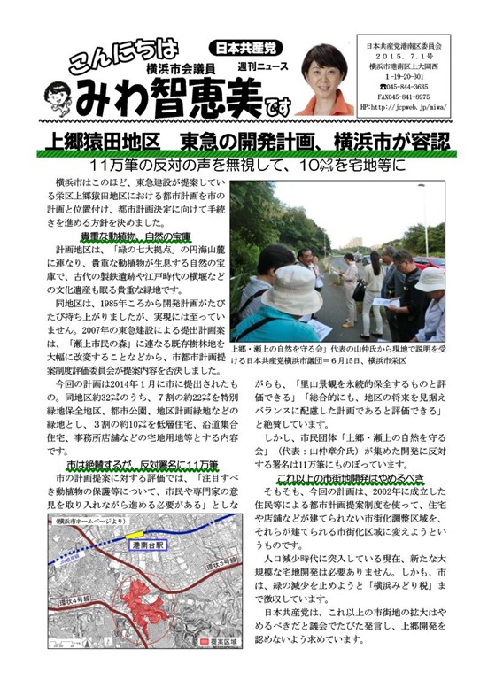 6月に入って横浜市は突然、東急建設が提案している栄区上郷猿田地区における都市計画を市の計画と位置付け、都市計画決定に向けて手続きを進める方針を決めました。 第二回定例議会が終わってから、建築局担当の議員に知らされた事態です。