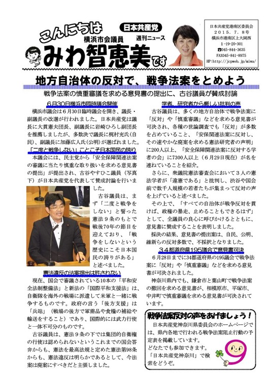 日本共産党市会議員団は、この日、本会議に提出された「安全保障関連法案の審議に当たり慎重な取り扱いを求める意見書の提出」(民主党提出)に対して、古谷やすひこ議員が賛成討論を行いました。