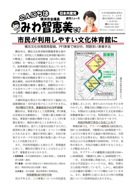 こんにちは15.7.29ー横浜文化体育館の再整備事業ーみわ智恵美ニュース
