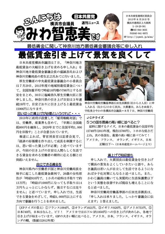 日本共産党横浜市議団は7日、「神奈川地方最低賃金の大幅引き上げを求める申し入れ」を神奈川地方最低賃金審議会長の盛誠吾氏および神奈川労働局長の若生正之氏あてに行いました。 申し入れでは、生活できる賃金をめざして、時給1,000円以上にする方向で審議を行うことを求めました。