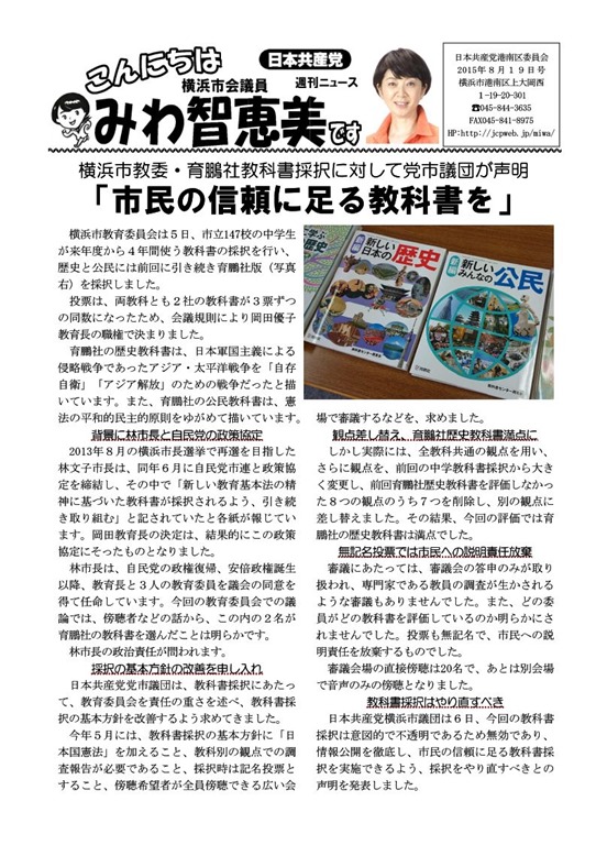 そして、今年は、林文子市長が任命した教育委員と教育長によって、育鵬社版の歴史と公民の教科書が選ばれました。
