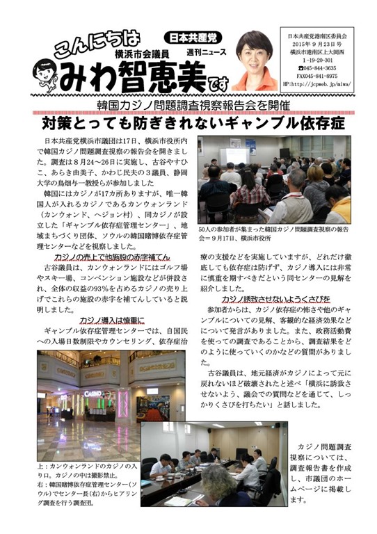 日本共産党横浜市議団は9月17日(木)、横浜市役所内で韓国カジノ問題調査視察の報告会を開きました。