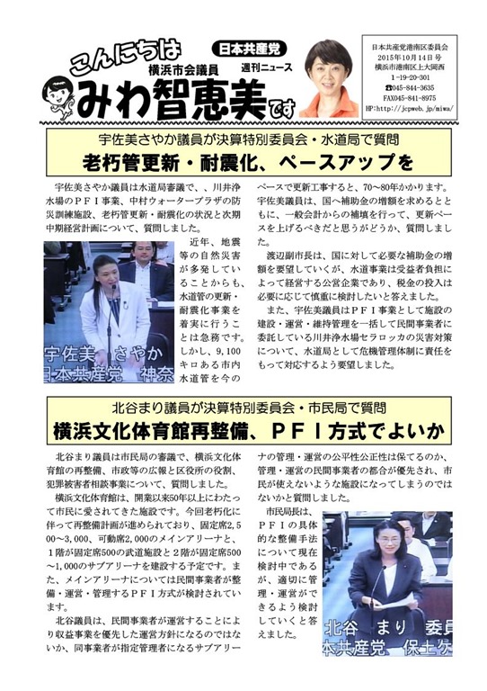 水道局審議で、宇佐美さやか議員は川井浄水場のPFI事業、中村ウォータープラザの防災訓練施設、老朽管更新・耐震化の状況と次期中期経営計画について、質問しました。