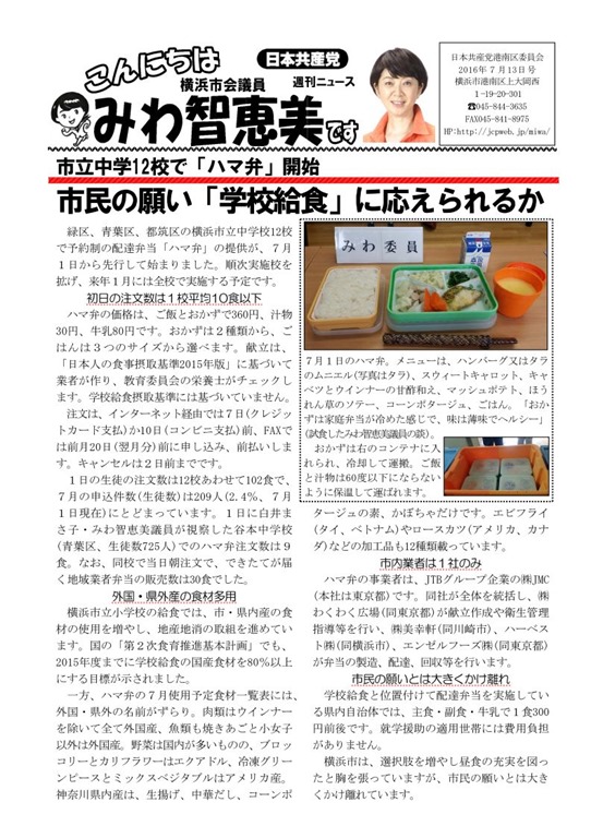 週刊みわニュース市立中学12校で「ハマ弁」開始 市民の願い「学校給食」に応えられるのでしょうか