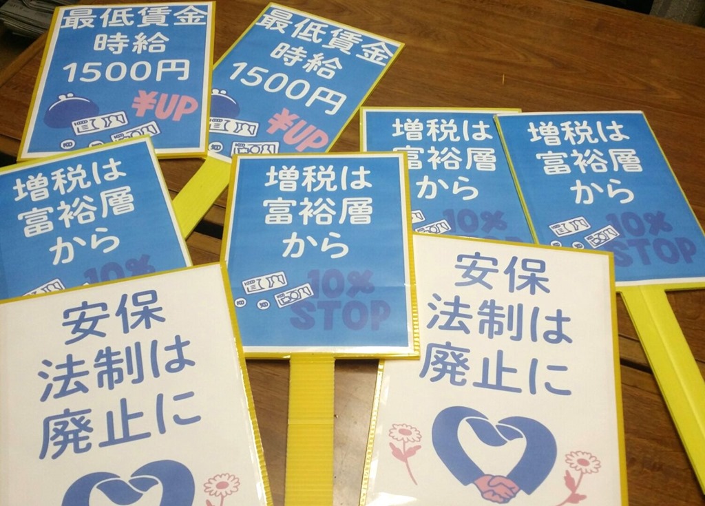 「最低賃金 時給 1500円」 「増税は 富裕層 から」「安保 法制は 廃止に」